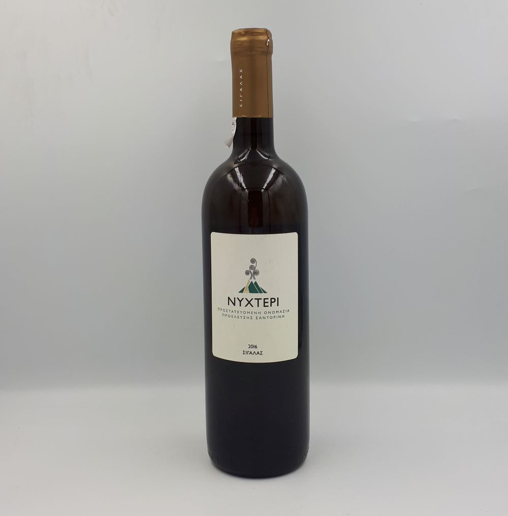 Γευστικά χαρακτηριστικά : Κίτρινο χρώμα, με χρυσαφί ανταύγειες. Μύτη πολύπλοκη, με αρώματα από ώριμα εσπεριδοειδή, μέλι, ξηρούς καρπούς και μεταλλικότητα, ως ιδίωμα του terroir της Σαντορίνης. Στόμα, πλούσιο, γεμάτο, με σύνθετα αρώματα στόματος, ισορροπία και λίγα σάκχαρα που προσδίδουν τον ιδιαίτερο χαρακτήρα στο Νυχτέρι.